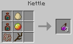 The Brew of Substitution allows unplaced blocks to be swapped with placed blocks. Simply drop any number of blocks onto the floor near to where you want to work, then throw the brew at the target area. All blocks in the area of effect of the same type as the block hit, will be substituted in a spiral pattern with the blocks that were dropped. This brew is made in a kettle using Ender Dew, and egg, Mutandis Extremis, Magma cream and an Ent Twig. |